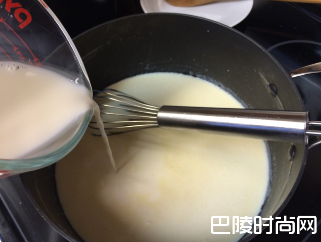 2在平底锅里中火加热融化黄油,然后加入面粉搅拌。慢慢加入牛奶,同时继续搅拌。