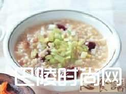 3.取一汤锅,加入高汤、1碗清水及作法1的绞肉、作法2的红枣、糙米以中火煮开后,转小火再放入少许盐续煮约30分钟,起锅前,加入芹菜珠续煮约1分钟即可。