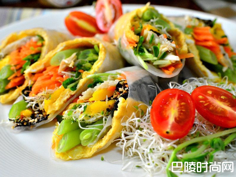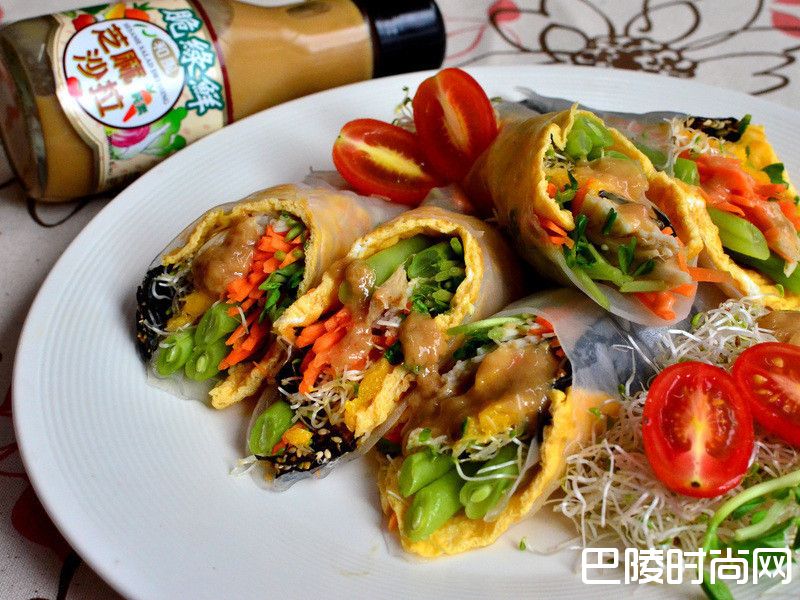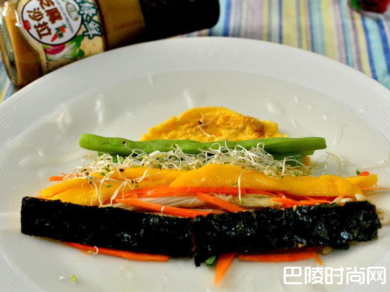 4放上,四季豆、蛋皮、金针菇、苜蓿芽、小豆芽、海苔南瓜子夹心片、红萝卜丝、芒果粗条,然后卷起来。