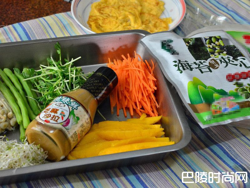 ,包含一瓶[谷盛芝麻脆绿鲜]。四季豆与金针菇烫好、红萝卜切丝、鲜芒果切粗条、小豆苗与苜蓿芽准备好,海苔片选用市售现成的海苔南瓜子夹心片(增加脆口口感)。河粉片~选用透明又Q弹的越南河粉米纸。蛋两颗打均匀后,放入少许盐,放入圆型模型的工具中于平底锅,煎成薄蛋皮。