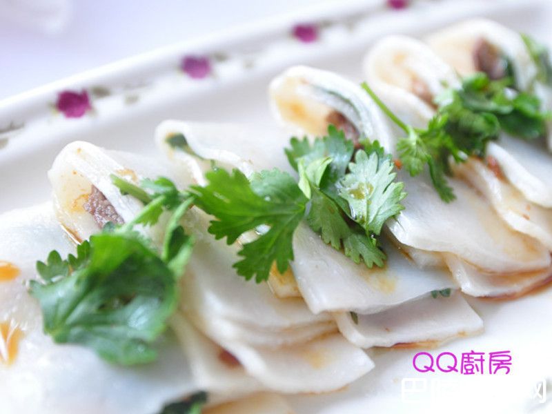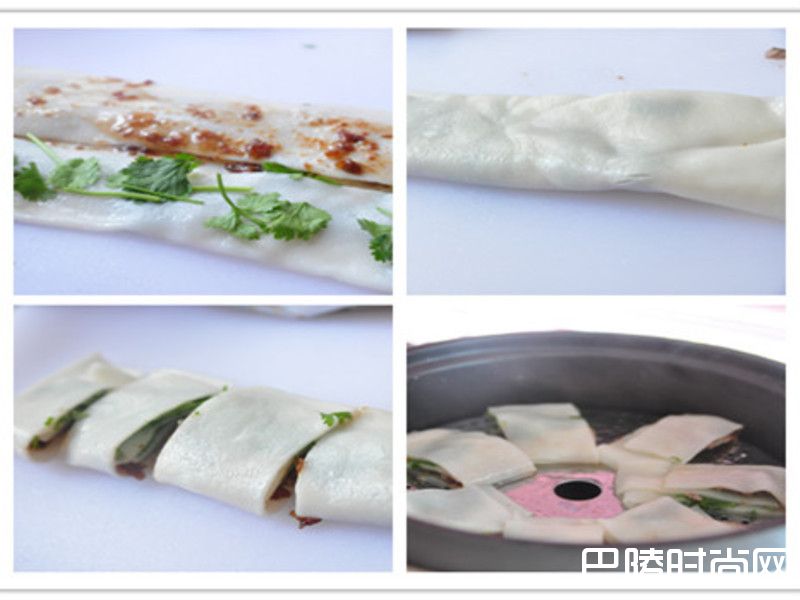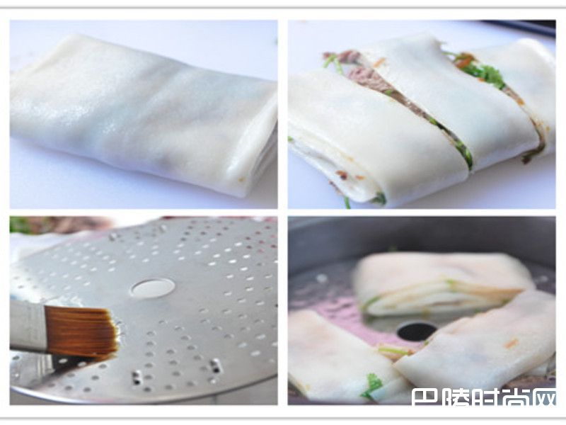 5另外也可以做成较薄的层次:取一张板条,于内层涂满肉燥酱,再分两边铺上牛肉片及香菜,将两边往内褶包覆,切成小小段,放入蒸盘蒸煮约7分钟