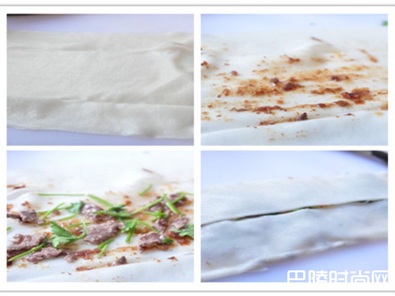 3取一张板条,于内层涂满肉燥酱,再将牛肉片及香菜铺上,两边对褶线向内褶包覆