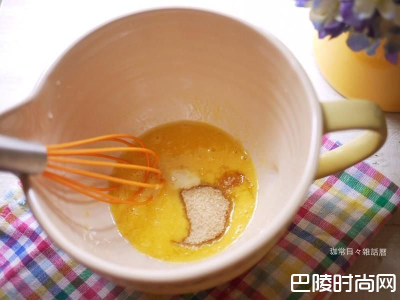 1先将蛋和沙拉油搅拌均匀,再加入糖及炼乳拌匀至溶解