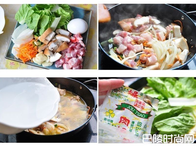 10备料齐全后,先下锅爆香拌炒,再加入适量的水滚煮,加入肉燥包等酱料调味