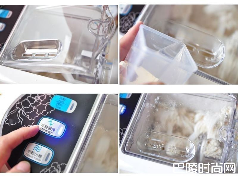 5打开搅拌杯盖,放进面粉后盖上杯盖,再由进水孔倒入冷水,按下手动搅面或是【自动按键也可】大约搅拌面粉10~15分钟