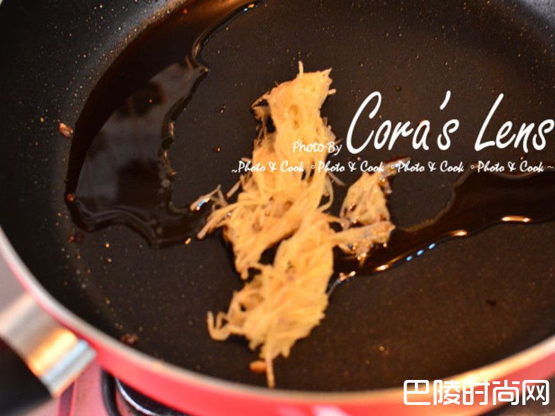 2将胡麻油倒进锅,慢慢的炒姜,大约三分钟。炒到胡麻油与姜的味道很香很香。
