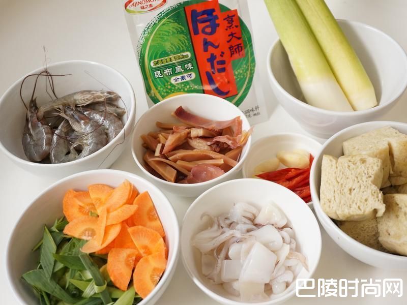 茭白笋2根 烤麸5个 鲜虾100g 花枝100g 鱿鱼100g 红萝卜1小块 蒜瓣4个 蒜叶1根 辣椒1根 烹大师昆布风味1-2/3茶匙 酱油2大匙 米酒2大匙 白胡椒1/4茶匙 做法