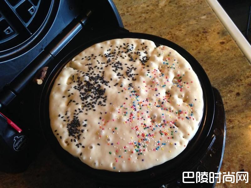 2松饼机刷上少许的葡萄籽油,奶油会更香,但容易会有心血管疾病的问题,倒入约8分满,约5秒后,盖上另一边,翻面,3分后即可以享用。