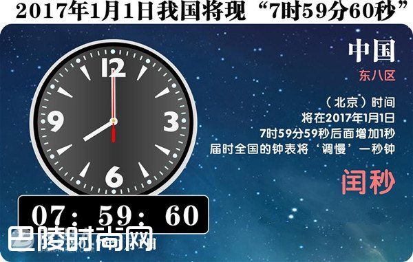 据悉2017年1月1日香港标准时间将会拨慢1秒。香港天文台表示,协调世界时将在香港时间2017年1月1日上午7时59分59秒和8时0分0秒之间加上一闰秒,届时香港标准时间也会同时拨慢1秒。