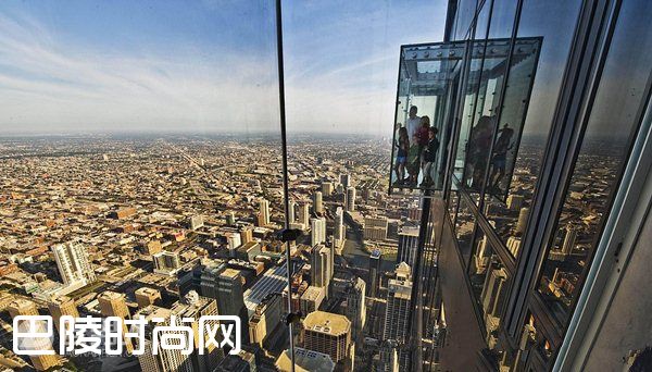 美国威利斯塔观景台在美国威利斯大厦第103层,它距地面412米,天气晴朗时可以看到美国的4个州。大厦官方表示,位于103层的观望台的窗玻璃每周都会留下数以百计的游客前额印痕,这激发了建造玻璃阳台的灵感。于是2009年6月在观望台增设了4个玻璃阳台。这些玻璃阳台全部建在大厦西侧,从瞭望台向外延伸约1.2米。阳台的玻璃地板厚达12.7厘米,可承重约5吨。
