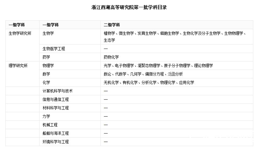 西湖大学前身为2016年12月成立的浙江西湖高等研究院,由施一公、陈十一、潘建伟、饶毅等著名科学家发起筹建,高等研究院分为生物学研究所、基础医学研究所、理学研究所、前沿技术研究所四个研究所。据了解,西湖大学坚持发展有限学科,以大学筹建依托主体——浙江西湖高等研究院的四个研究所为基础,组建生命科学学院(含生物学和基础医学)、理学院、工学院,优先形成理学、医学、工学等三个门类12个一级学科,今后随着大学的发展,将适时设立人文社科学院和相关学科。