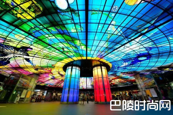 位于台湾高雄的美丽岛站正如它的名字一般充满吸引力。站内的“光之穹顶”由人称“水仙大师”的意大利艺术家Narcissus Quagliata打造,耗时近四年,使用了四千多块彩色玻璃。这件全世界最大的单件玻璃艺术品的设计理念结合了人民的美好祝愿和神秘的自然,展现了浩瀚宇宙中的万物荣枯,一蓝一红两根柱子亦体现了阴阳两极的文化概念。