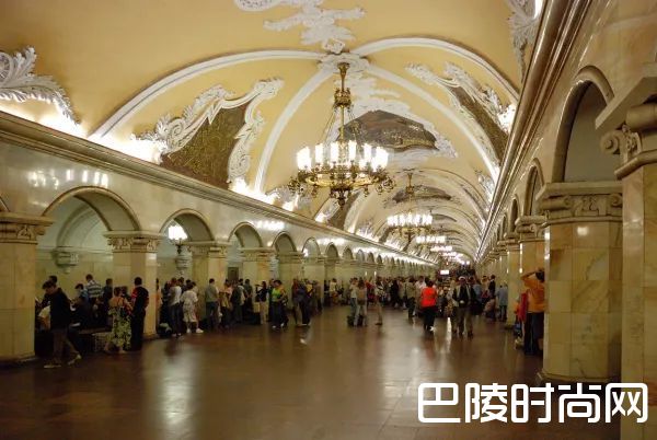 能与斯德哥尔摩地铁站叫板的,也许只有莫斯科的地铁站了。作为莫斯科地区重要的交通枢纽之一,地铁共青团站设计得特别隆重大气。车站设计的初衷是激发人民的民族自豪感,极力体现了当时苏联俄国的繁华。地铁的天花拱顶是鲜亮的金黄色,伴有雕刻精美的白色浮雕和艺术拼贴的马赛克,并且相隔不远就有一盏华丽的吊灯,使得整个站台长廊有如宴会大厅一般金碧辉煌。