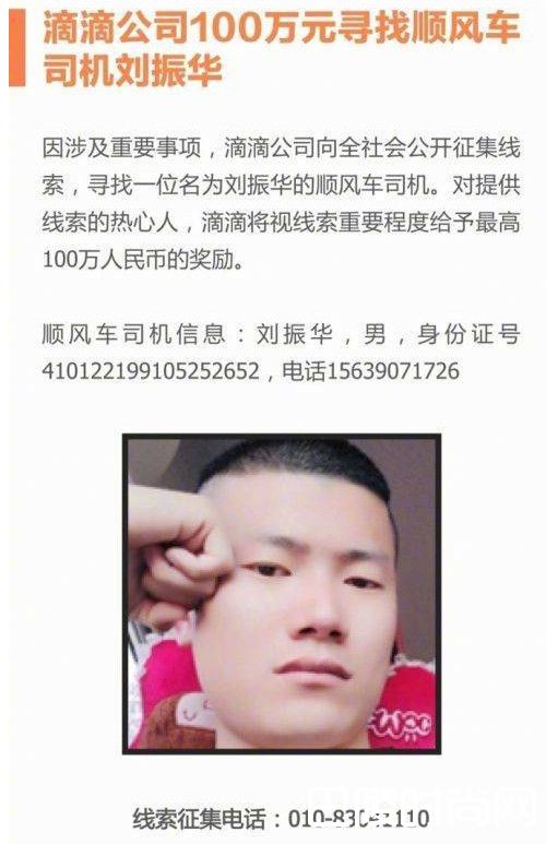 顺风车司机信息:刘振华,男,身份证号410122199105252652,电话15639071726;线索征集电话:010-83041110。