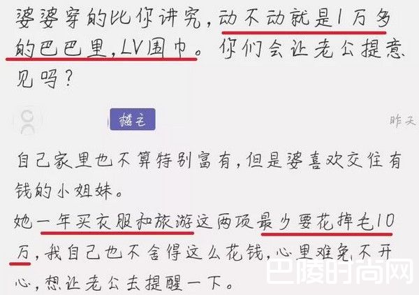婆婆和儿媳之间那点事儿,总是理不清,道不明,隔三差五就得出点小插曲,这不近日又有网友出来吐槽自家婆婆了。为了和有钱小姐妹比个高低,家境一般的婆婆花钱如流水,动不动就是一万多元的巴巴里服饰、LV围巾,喝茶要喝几千元一斤的,一年内在买衣服和旅游这两项上最少的花费10万元。