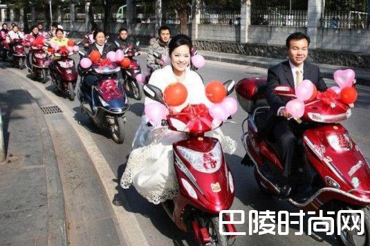 一对新人和他们亲友选择了电动摩托作为“婚车”,后面一排排的都是电动车,虽然不是什么豪车,但新娘脸上还是充满了幸福的笑容!