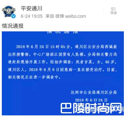 下午7点过,通川区公安分局官方微博发出通报:女子46岁,通川区人,6月8日因患病一直在接受治疗,目前相关情况在进一步调查中。