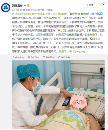 就在今年1月10日,这名病患听到王菲经典歌曲《传奇》后,出现眼球运动加快、微微睁眼、眼眶湿润等反应。2月2日,从深度昏迷中清醒12天的岑阳,已经能够和家人进行简单的交流和肢体的活动。
