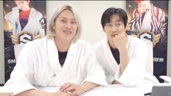 希澈和银赫23日晚间现身虎牙直播SM超级偶像联赛,穿着浴袍与粉丝互动。由于参与的大多是大陆粉丝,母语不是中文的他们,也特别请了一位翻译。在互动环节中,点到一名ID昵称为李秀满的ATM的粉丝。
