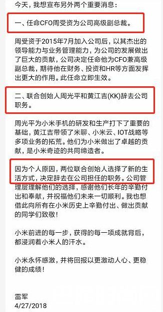 不过现在看来,休息一个月的黄江吉始终未能重回小米核心管理层。如今雷军终于在小米上市之前宣布了周光平、黄江吉两位创始人的离开,4月27日上午还有媒体爆料说小米最早在下周一提交赴港上市申请。不得不说,这个时间点,两位合伙人的辞职,还是很值得玩味的,也值得一声叹息。