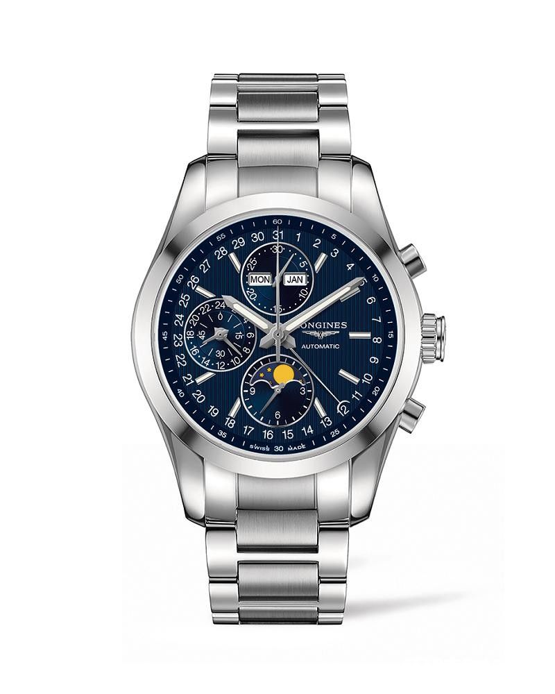 直径42毫米的男士腕表拥有精钢表壳,搭载L678自动上链机械机芯,蓝色表盘上镶有9个涂有Super-LumiNova®夜光涂层的时标,优雅地烘托出月相显示功能。6时位置设有12小时计时盘、9时位置设有24小时显示功能与小秒针,12时位置则设有30分钟计时盘,以及月份和星期显示窗。半月形中心指针指示日期。