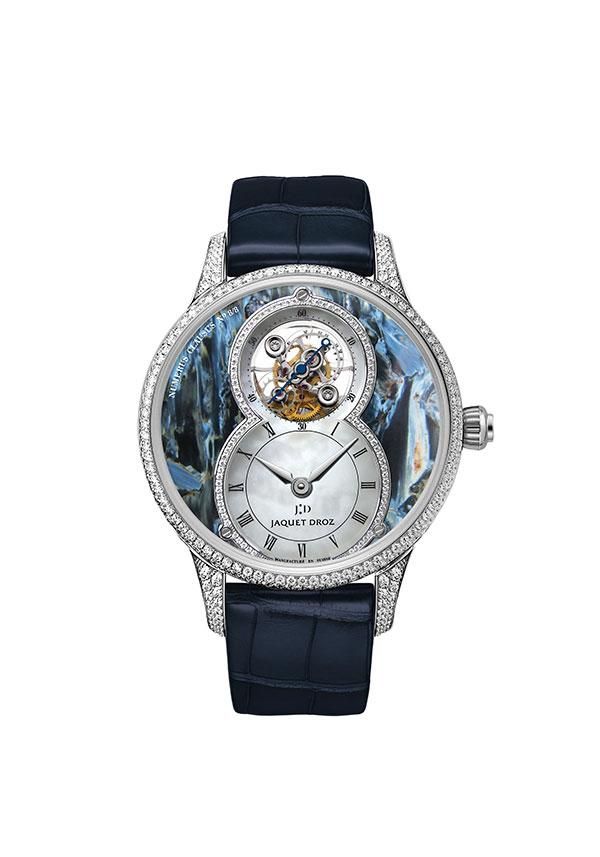 不仅如此,雅克德罗更将品牌独有矿石美学嵌入陀飞轮大秒针系列。形形色色的矿石材料激发出雅克德罗的无限灵感。这些美石璀璨瑰丽的自然光彩,在雅克德罗艺术工坊的大师们传世工艺下,改变了粗糙的原始状态,在矿石自然独特的颜色与光彩的基础上上赋予他们全新的质感,表盘上光芒、色彩和深邃感变幻莫测,使其超越物质,迸发惊艳光芒,在陀飞轮大秒针系列上呈现出不朽的美态。