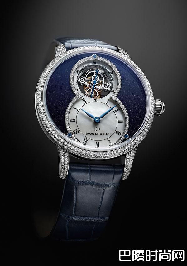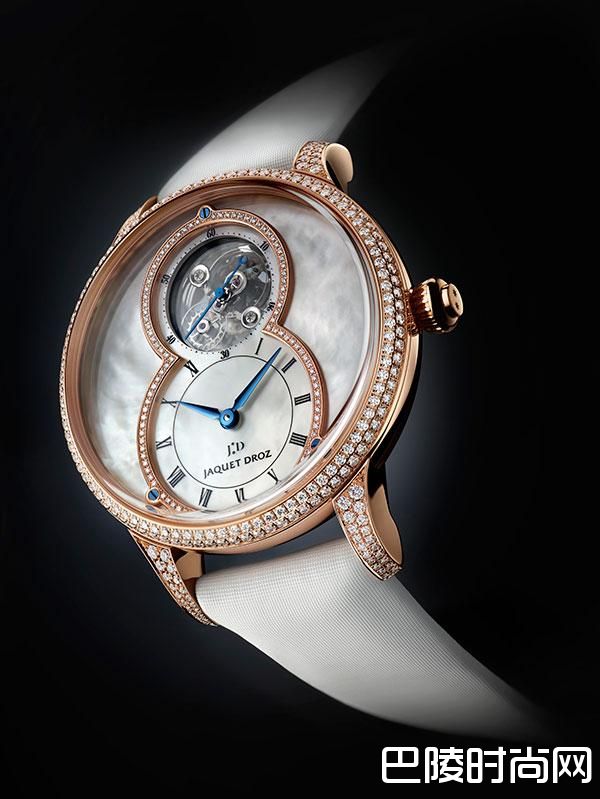 同时雅克德罗首次为陀飞轮装配硅质擒纵叉和摆轮游丝,让此令人目眩神迷的微雕杰作具备高精准度,珍珠母贝陀飞轮大秒针兼具优雅设计和卓越技术性能,精巧独妙,弥足珍贵。此表款限量发行88枚。数字8的轮廓与表盘设计相互呼应,表盘熠熠闪耀着珍珠母贝的柔光淡彩与钻石的璀璨光芒。
