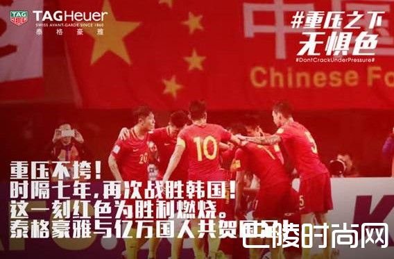 重压之下,熊熊燃烧的中国梦不垮;重压之下,携手并进的中国情不熄;时隔七年,再胜韩国,中国之队,毫无惧色!这一刻燃烧的红色是中国红,是胜利的中国红!TAG Heuer泰格豪雅将以中国足协中国之队官方腕表合作伙伴,继续秉承#DontCrackUnderPressure#(重压之下无惧色)的品牌先锋精神,携手中国之队砥砺前行重压之下无惧色!泰格豪雅与14亿国人共贺国足!比肩前行!