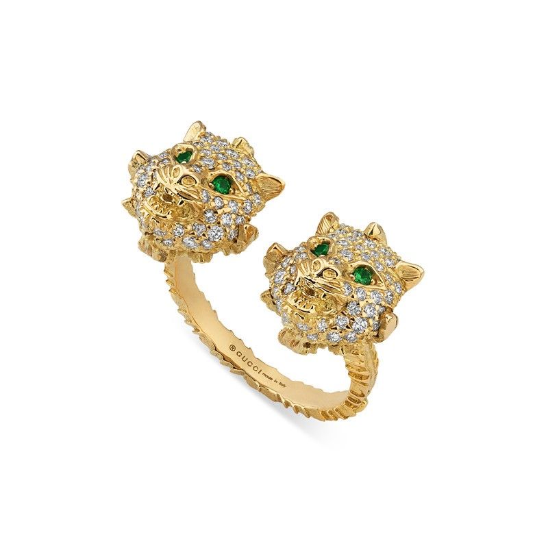 Le Marchédes Merveilles系列总让人想起“奇珍宝盒”—满眼新奇迷人的动物造型和贵重宝石。Gucci此次为该系列增添了精美新作,继续探索动物题材—重点打造虎头设计元素。该系列包含各种不同的主题和多种贵重宝石搭配,从镶嵌钻石和沙弗莱石的夺目白、绿色组合,到橙、红和蓝色蓝宝石的多彩组合。帕拉伊巴托帕石、黑色尖晶石和珍珠、黄金色黄石英以及华丽紫色和深红色红宝石的使用令虎头造型本身颇显深邃立体、生动逼真。而灰色钻石和珍珠的使用则增添一丝精制细腻的光泽。这些新作以18K金、复古银以及贵重宝石精制而成,充分彰显出品牌精湛的工艺和非凡的创意。