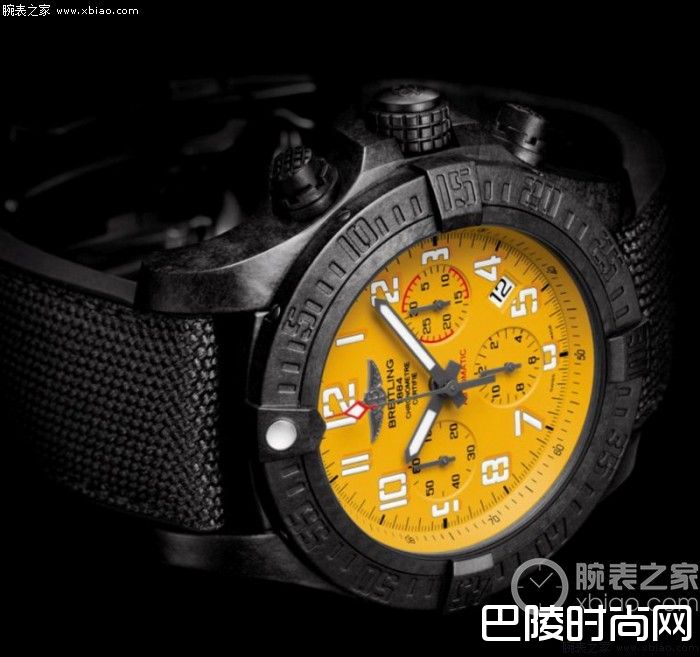 表盘呈黄色或黑色,装饰荧光时分针和航空模制数字时标。表带由黑色橡胶和超耐用的军用纤维面料完美结合,并搭配黑色精钢PVD表扣。