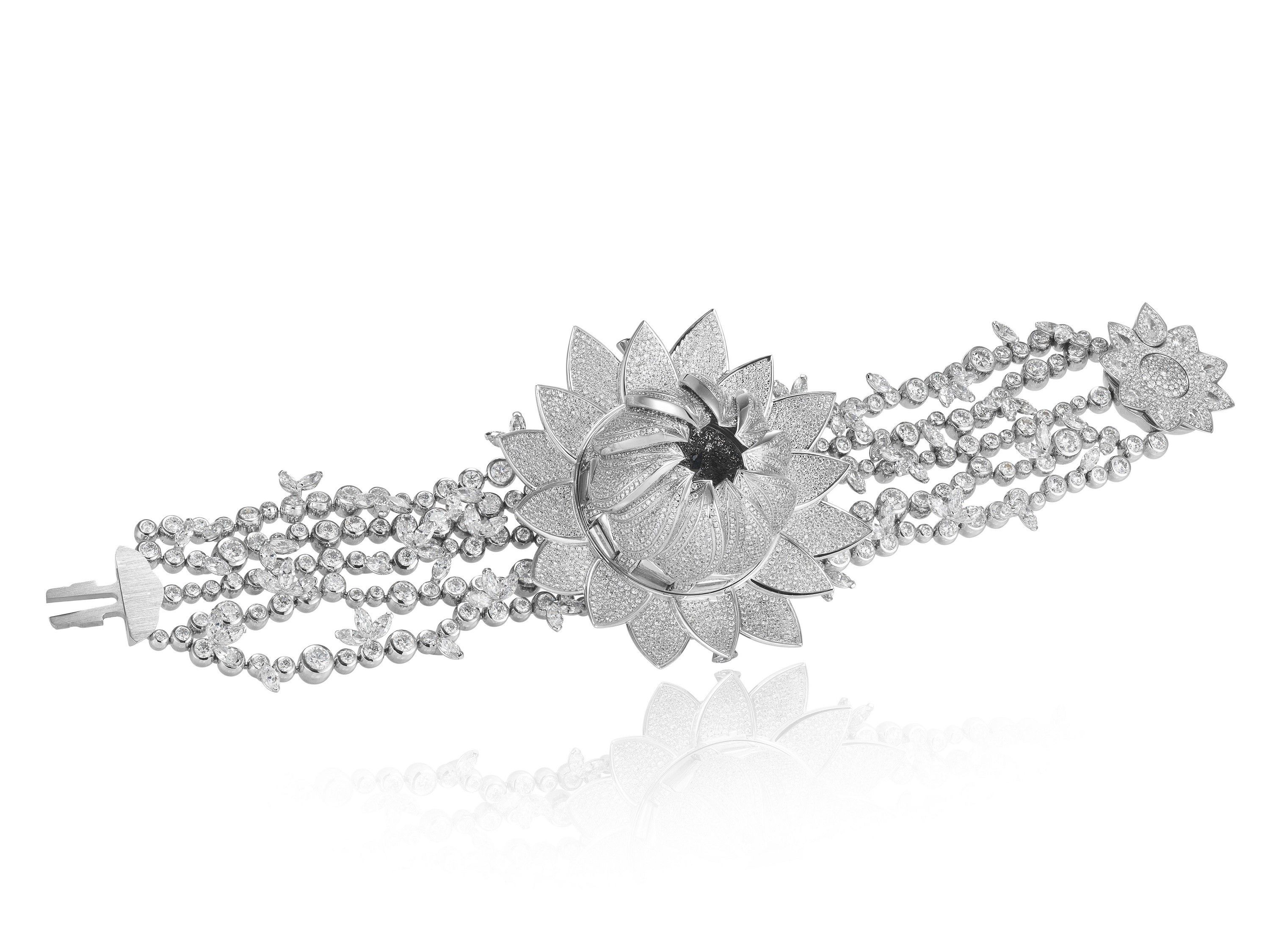 这款珍贵的腕表总共镶嵌了25.66克拉白色钻石,是工匠们悉心作业的完美呈现。从设计师到钟表工匠,从珠宝商到宝石镶嵌师,众多享有声望的高级珠宝工匠将自己的才华与这个大胆的梦想结合在一起,赋予其生命:闪闪发光的花瓣如同洒满了露珠,璀璨绽放;柔和的手链由几排细长的钻石组成,使人联想到在泛起涟漪的水波中挺立的花朵,令人惊艳不已。这朵莲花被钻石的璀璨华光簇拥环绕,瞬间绽放后又于无尽优雅中悄然沉睡。