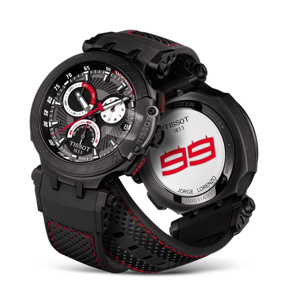 图7/8:天梭竞速系列托马斯·卢斯2018限量款腕表另一位与天梭全球代言人乔治·洛伦佐(Jorge Lorenzo)是一位风格优雅、一丝不苟的骑手,曾多次获得冠军称号。天梭竞速系列乔治•洛伦佐限量款2018腕表的诞生完美诠释了他独有的风格魅力。细节装置中设计的巧思展露无遗,融入了洛伦佐车队的主色调,并在表盘上配以红白色细节装饰,低调且不失格调。该系列同样将MotoGPTM官方标志丝印于玻璃后盖上,采用头盔式表盒包装,全球限量发行4999枚。
