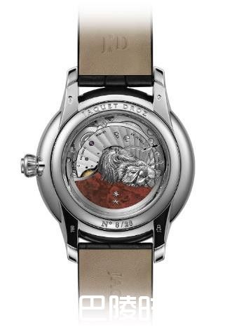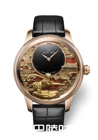 第一款金雕灵犬时分小针盘(Petite Heure Minute Relief Dog)腕表以红金表壳搭配黄金雕纹,以极其细腻的手法营造鲜明对比,红金指针游走于缟玛瑙表盘中央。白金款的白色珍珠母贝表盘中央点缀同样的立体雕纹。摆陀细节亦精心考究,以金和赤铜矿背景向亚洲传奇致敬,并为两款腕表的自动机制提供动力。
