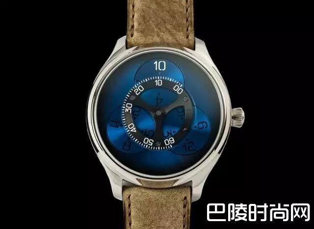 亨利慕时与Hautlence合作,将三个旋转小时光盘集成到时髦的蓝色表盘和一个中央分钟盘,制作了一款轨道时间显示的腕表。