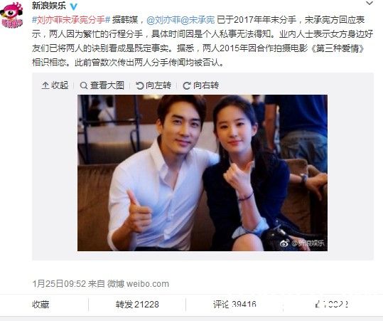 1月25日,韩国男星宋承宪宣布与刘亦菲正式分手,结束了这段维持了2年多的跨国恋情。消息一放出,众多的网友的反应可谓是“欢天喜地”,还有网友在刘亦菲公开恋情时就建立了一个分手倒计时的微博,看来大家都真的不舍得把神仙姐姐拱手让给外人! 下一页