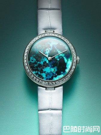 每个面盘就是一幅美景,以Les Pierres de Rêve de Chaumet黄碧玉腕表为例,巧妙展现如阳光洒落山景图案;另一款玛瑙面盘腕表,好似雪景中的一抹植物生机,Chaumet取得恰到好处的纹理构成浪漫景致;而采用矽孔雀石面盘的腕表,则如万花筒般色彩斑斓。