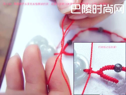 2、 绳端一起穿过吊坠挂件孔。
