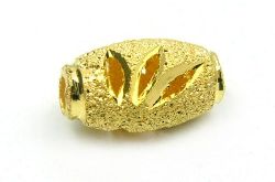 转运珠以含量为99、9%的首饰金——千足金打造的黄豆大小、橄榄球形状的小金珠。珠子中间被掏空,以便以红绳串联;千足金转运珠外表为立体造型,以磨砂、喷砂工艺铸造,工艺精致,造型精美。