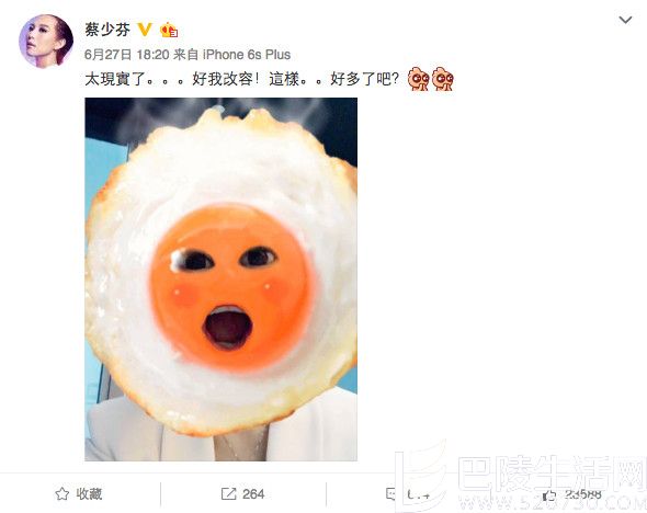 蔡少芬,1973年出生于中国香港,是一名演员,也是一名模特,1997年,她参加香港小姐选美比赛获得季军。之后参演过很多电影及电视剧,在内地拥有很高的人气。2011年因主演中国内地宫廷争斗戏《甄嬛传》再度走红,2015年参加了一系列真人秀节目,其中以《偶像来了》最能体现她豪爽,开朗,积极的真性情。上面这张图片就是选自蔡少芬微博内容,自黑已经是她的常态,自己玩得不亦乐乎!
