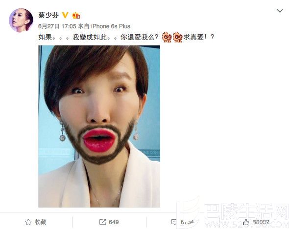 上面这张图片也是选自蔡少芬的微博,她用P图软件将自己弄成如此模样,并附上文字:如果我变成如此你还爱我么?求真爱!网友直呼可爱,微博底下的评论更是有趣,有网友评论说:我只爱你的极致美颜,变成这样的话,那,那我给你钱去整容,哈哈哈哈哈哈。这无疑是她的真爱粉呀!也有网友开玩笑说:我要脱粉!娘娘你别闹!谁要是说爱,那一定是睁着眼睛说瞎话!哈哈哈哈!可见娘娘的真性情真的让人很喜欢呀。