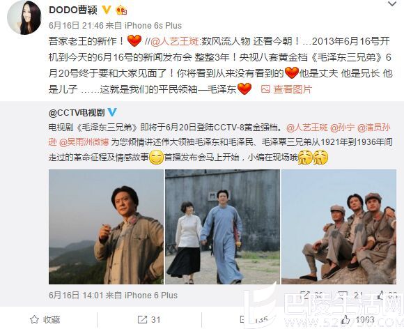 在曹颖转发电视剧《毛泽东三兄弟》这条微博的评论下面,网友们纷纷留言说会支持这部电视剧,也说了曹颖的丈夫王斑和毛泽东真的有几分相似,还有可爱的网友提醒曹颖,说王斑在剧照中牵了别的女演员。曹颖虽然现在的活动少了,但是可见粉丝们还是很关心她的生活的,也希望现在家庭很美满很幸福的曹颖,能够一直像现在这样幸福下去。