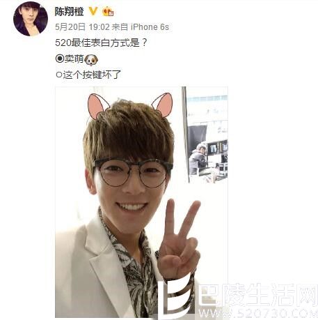 520最佳表白方式是什么?对于这样一个问题,可谓是仁者见仁、智者见智。5月20日,陈翔在微博陈翔橙晒出对这一问题的个人见解,他认为520的最佳表白方式即卖萌。一张俏皮迷人的笑脸,一头帅气褐发中长出一对粉白粉白的可爱猫耳,戴上一副圆圆的大眼镜,最后再配上经典的剪刀手。这微博配图,呆萌系数百分百,简直萌死万千少女。我想,520当日,应该有不少妹纸在舔屏吧!