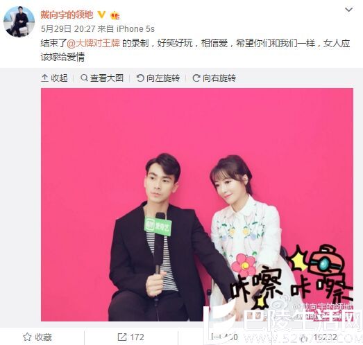 戴向宇在微博上还会常常对着自己的新婚妻子陈紫函示爱,在参加完节目《大牌对大牌》的录制之后,戴向宇在微博晒出了一张他和陈紫函的合照,两个人看上去非常般配。戴向宇还说“相信爱,希望你们和我们一样,女人应该嫁给爱情。”,这样公然虐狗,让小编我看到都觉得非常羡慕陈紫函,能够和一个那么爱自己的男人组建一个幸福的小家庭。