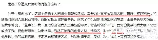 对于其离职原因,外界议论纷纷。有传叶宁被架空,也有传万达给的股权让叶宁不满足。但随后叶宁在接受媒体专访时明确表示:离职是个人的职业调整和选择,对于万达情感上难以割舍。