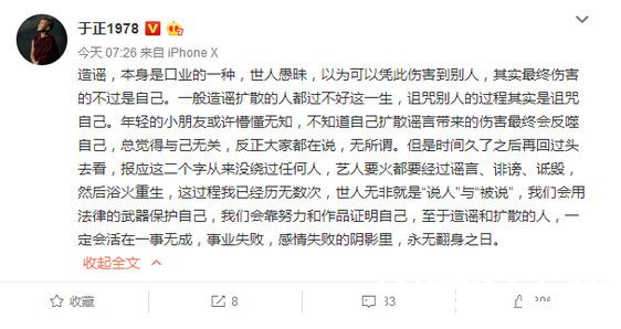 于正:造谣,本身是口业的一种,世人愚昧,以为可以凭此伤害到别人,其实最终伤害的不过是自己。一般造谣扩散的人都过不好这一生,诅咒别人的过程其实是诅咒自己。年轻的小朋友或许懵懂无知,不知道自己扩散谣言带来的伤害最终会反噬自己,总觉得与己无关,反正大家都在说,无所谓。但是时间久了之后再回过头去看,报应这二个字从来没绕过任何人,艺人要火都要经过谣言、诽谤、诋毁,然后浴火重生,这过程我已经历无数次,世人无非就是“说人”与“被说”,我们会用法律的武器保护自己,我们会靠努力和作品证明自己,至于造谣和扩散的人,一定会活在一事无成,事业失败,感情失败的阴影里,永无翻身之日。