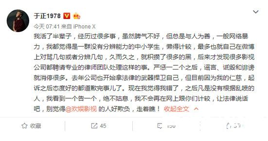 于正:我活了半辈子,经历过很多事,虽然脾气不好,但总是与人为善,一般网络暴力,我都觉得是一群没有分辨能力的中小学生,懒得计较,最多也就自己在微博上对骂几句或者分辨几句,久而久之,就积攒了很多的黑,后来才发现很多影视公司都聘请专业的律师团队处理这样的事。严惩一二个之后,谣言、诋毁和诽谤就消停很多。去年公司也开始拿法律的武器捍卫自己,但目前因为我的仁慈,起诉之后态度好的都道歉完事儿了。现在我觉得我错了,之后凡是没有根据乱喷的人,我看到一个告一个,绝不姑息,我不会再在网上跟你们计较,让法律说话吧,别觉得@欢娱影视 的人好欺负,走着瞧!