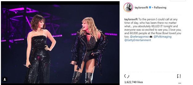 随后,泰勒也在社交平台上分享了与赛琳娜在台上的合照,并标记对方:“给那位我1天24小时,随时随地、无论如何都可以联络的人,你今晚的表现真的太棒了,所有人都很开心见到你!我爱你,还有Rose Bowl体育馆的6万人也都很爱妳。”其实两人在2014年传出不合后,赛琳娜先前曾在泰勒丝28岁生日当天,分享一段两人的影片,在社交平台上献上生日祝福,正式破冰,这一次也是两人在吵架后,首次再度同台,因此粉丝都非常兴奋也很激动,并喊话要两人永远都可以这么要好。