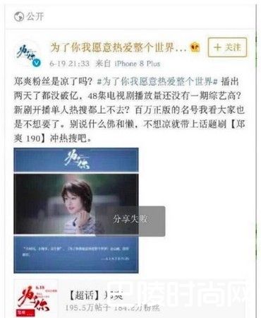 郑爽演出《微微一笑很倾城》成为校园剧女神, 率真个性被昵称爽妹子,人气度飙升,下一部《夏至未至》回春当高中女生,虽然挂名女主角,但后面戏份几乎被剪光,引来粉丝抗议。她这次回归《为了你我愿意热爱整个世界》备受期待,但播出后反应不如预期,甚至没有上热搜榜,官方微博发文直接酸粉丝,引起轩然大波,此文目前已经删除,之后发声明道歉郑爽以及粉丝。