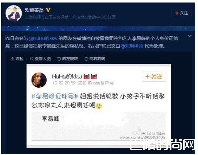 最令人恼火的还是李易峰,2015年10月份,就有网友在微博公开李易峰的个人身份证信息。李易峰所属经纪公司负责人发文称,该行为已侵犯李易峰的隐私权,现已交由律师处理。
