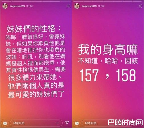 梧桐妹17日在IG的限时动态回答网友问题,透露2个妹妹们的性格,咘咘的脾气很好,也会礼让妹妹,但如果被人欺负了,暗地里也会欺负回去。至于BO妞,就不像在《妈妈是超人》里那么乖,性格其实很像男孩,要照顾她需要非常多体力,让网友惊呼我的天、好聪明,而梧桐妹藏不住对妹妹们的疼惜:他们两个人真的是最可爱的妹妹们了。
